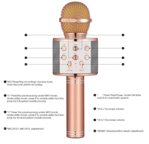 - Fácil de usar: este micrófono bluetooth no es nada complicado de usar. Solo hay unos pocos botones fácilmente comprensibles, como los botones deslizantes para el volumen del micrófono y la mezcla, los botones +/- para el volumen del altavoz y para cambiar de canción, etc. Una vez conectado a su dispositivo (o tarjeta microSD), ¡es hora de la fiesta!